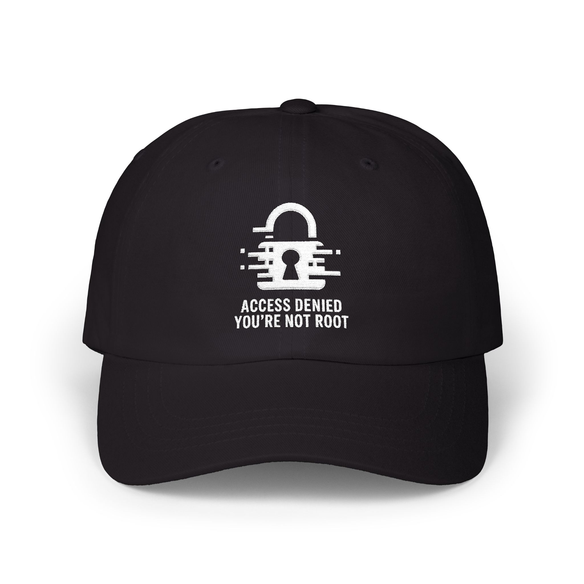 • Cybersecurity-Inspired Design – Features a stylized padlock icon with glitch-style lines symbolizing data streams, paired with bold “ACCESS DENIED YOU’RE NOT ROOT” text in a clean sans-serif font, making an unapologetic statement for hackers, sysadmins, coders, and anyone fluent in digital defense.
