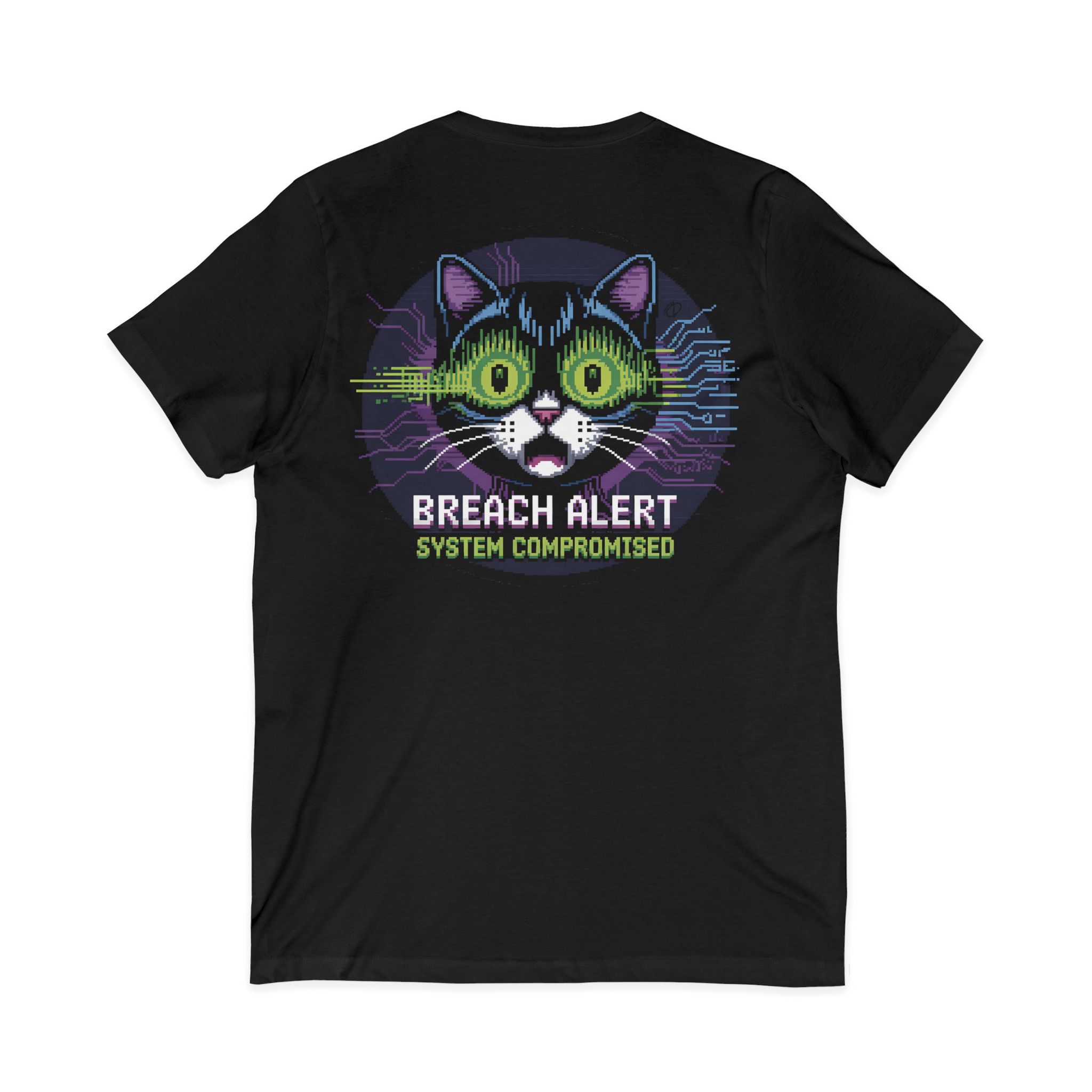 When cyber threats and retro gaming aesthetics collide, you get this standout V-neck tee. Designed for those who live on the tech edge, this shirt features a striking pixel art graphic of a startled cat with glowing eyes and digital glitch effects that scream digital defense mode activated. The bold “BREACH ALERT SYSTEM COMPROMISED” message taps into cybersecurity lingo while turning heads. Crafted from soft, breathable cotton, this tee balances sharp style with all-day comfort, ready to fit seamlessly into your streetwear or casual lineup. Pair it with your favorite jeans or layer it under a jacket for tech-savvy style that speaks your language.