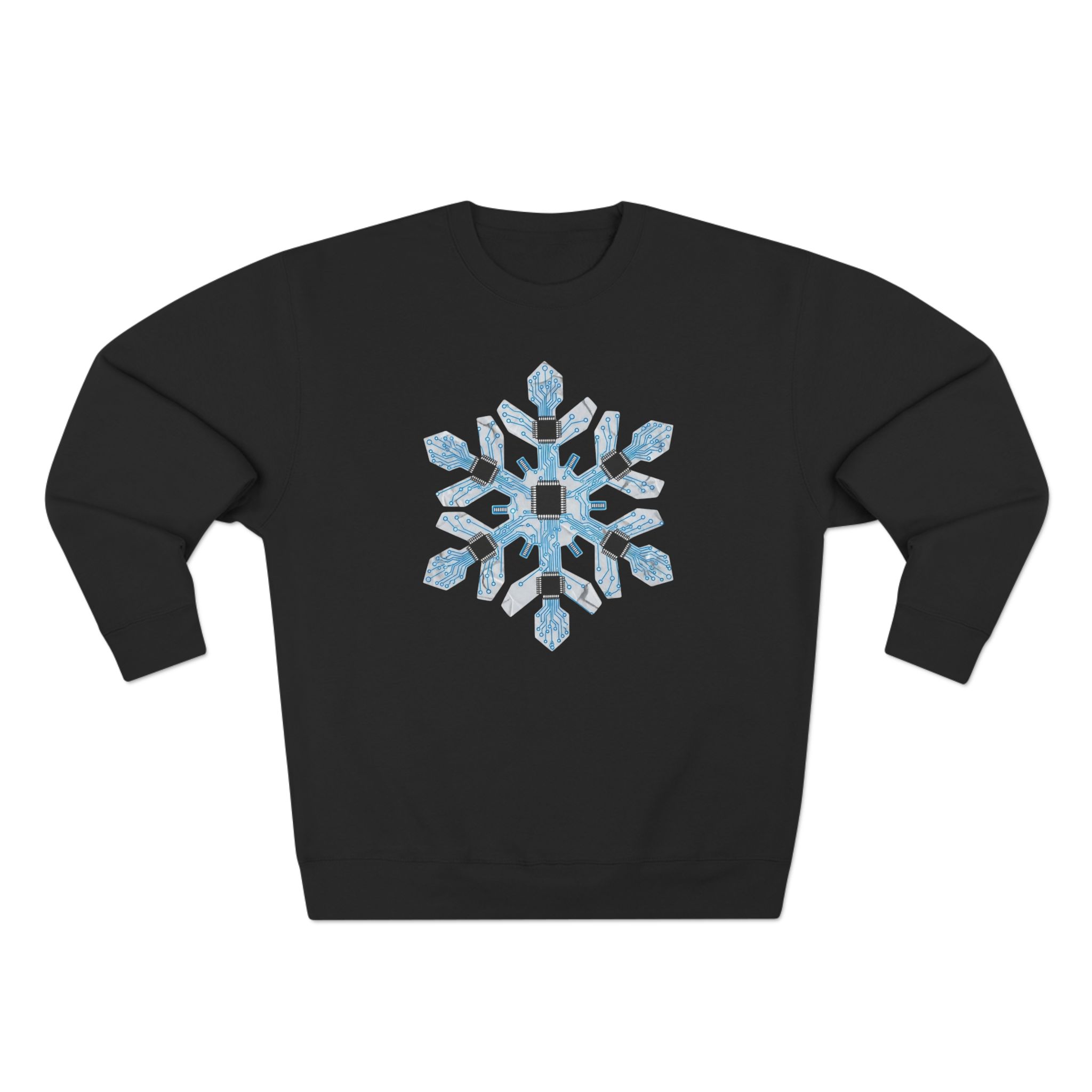 This circuit board premium sweatshirt features a striking, large-scale graphic centered on the chest. At first glance, it’s a classic winter snowflake. Look closer, and you’ll see the intricate details of the information superhighway. The crystalline structure is rendered in glowing blue circuit board traces, connecting a network of black microchips and a central processor nucleus.