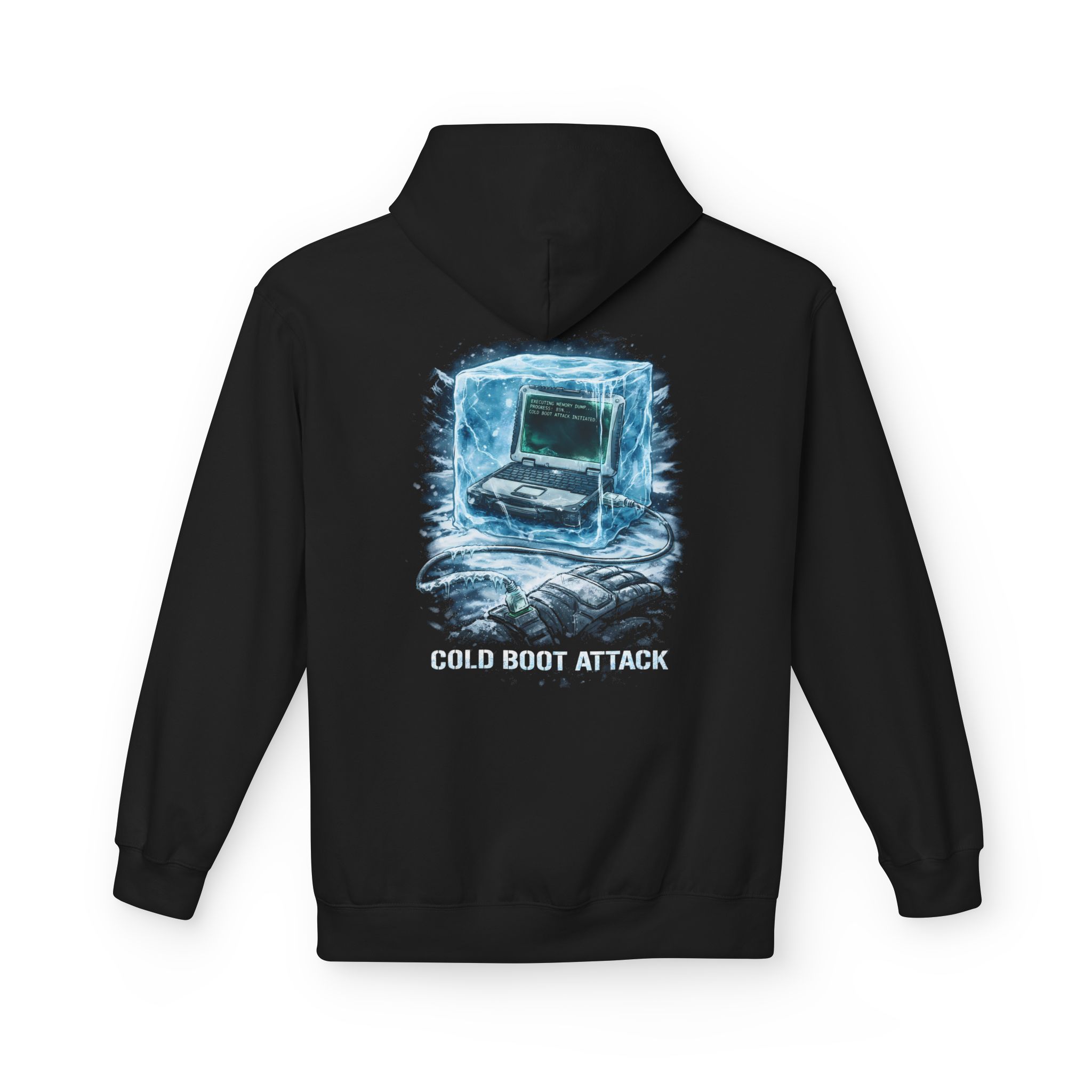 This one is for the people who read “INITIATING MEMORY DUMP” and immediately know what time it is. The back graphic features a rugged laptop locked inside a cracked block of ice, terminal text glowing like a late-night incident response window, and a tethered data device pulling secrets out of frozen memory. Under it, the callout hits clean and loud: COLD BOOT ATTACK. If your idea of winter vibes includes side-channel lore, RAM decay, and a little infosec swagger, welcome home.