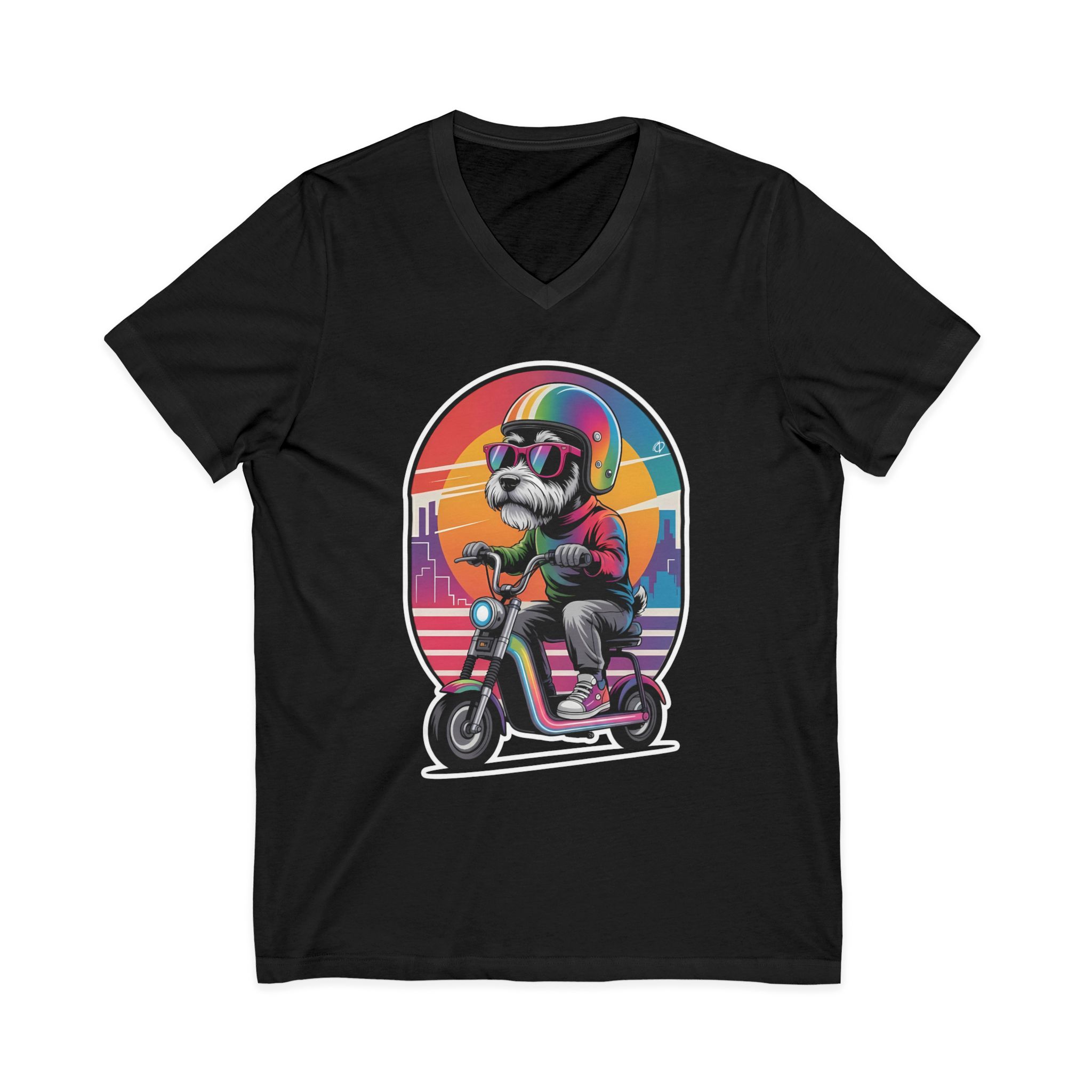Unleash your inner tech rebel with this cyber-inspired V-neck tee featuring a savvy scruffy dog cruising a sleek scooter through a retro-futuristic cityscape. Designed for those who blend urban hustle with digital swagger, this soft cotton shirt offers breathable comfort and a modern silhouette. The vivid rainbow-striped helmet and gradient gear on the dog graphic highlight your fearless style as you navigate both city streets and data streams. A staple for pairing with your go-to jeans or layered under your smart blazer, this tee keeps you looking sharp while you debug life’s code.