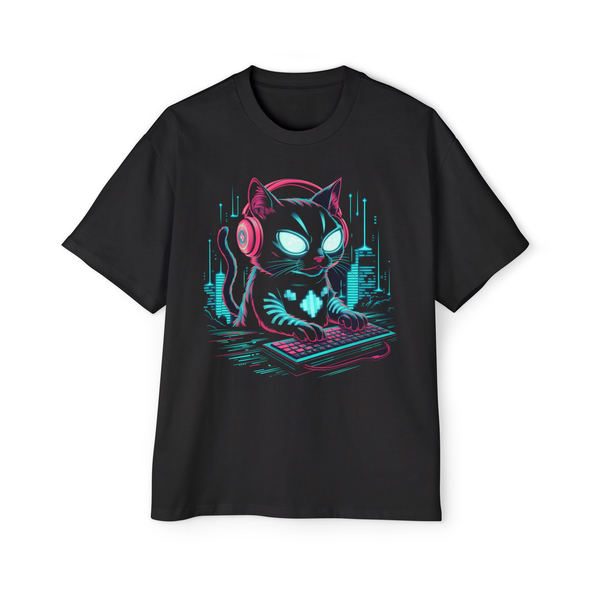 Step into the neon-lit world where cyberpunk aesthetics fuse with street-ready style. This shirt features a bold graphic of a hacker cat in full glitch mode, with glowing cyan circuit-like stripes, intense neon eyes, and magenta headphones, all set atop a futuristic cityscape buzzing with digital energy. Crafted for those who thrive in the tech and gaming realms, its relaxed fit and soft cotton ensure you stay comfortable whether you are coding deep into the night or just dominating the digital scene.