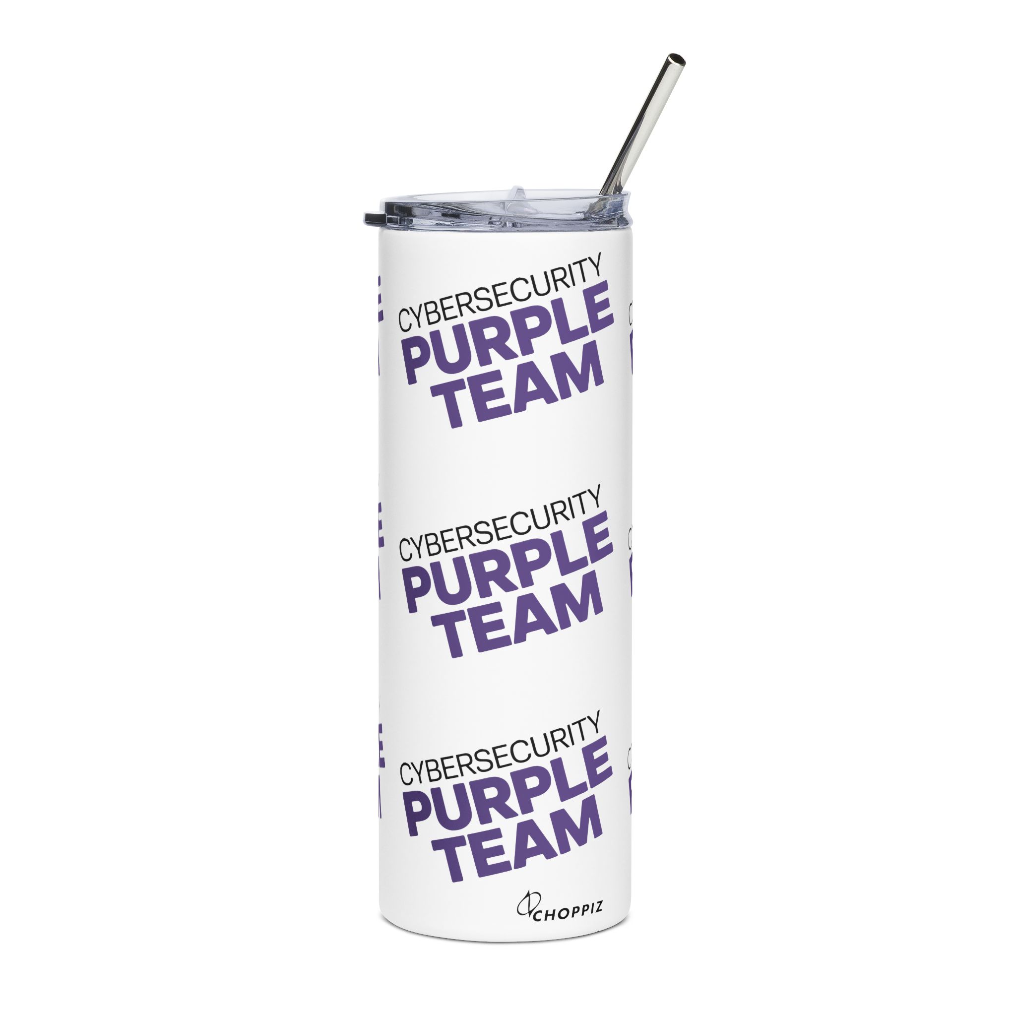 Wrapped in repeating CYBERSECURITY PURPLE TEAM typography, the design represents collaboration between offense and defense—clarity through communication, strength through alignment. The clean white base keeps it sharp, while the purple lettering signals insight, strategy, and shared intelligence.