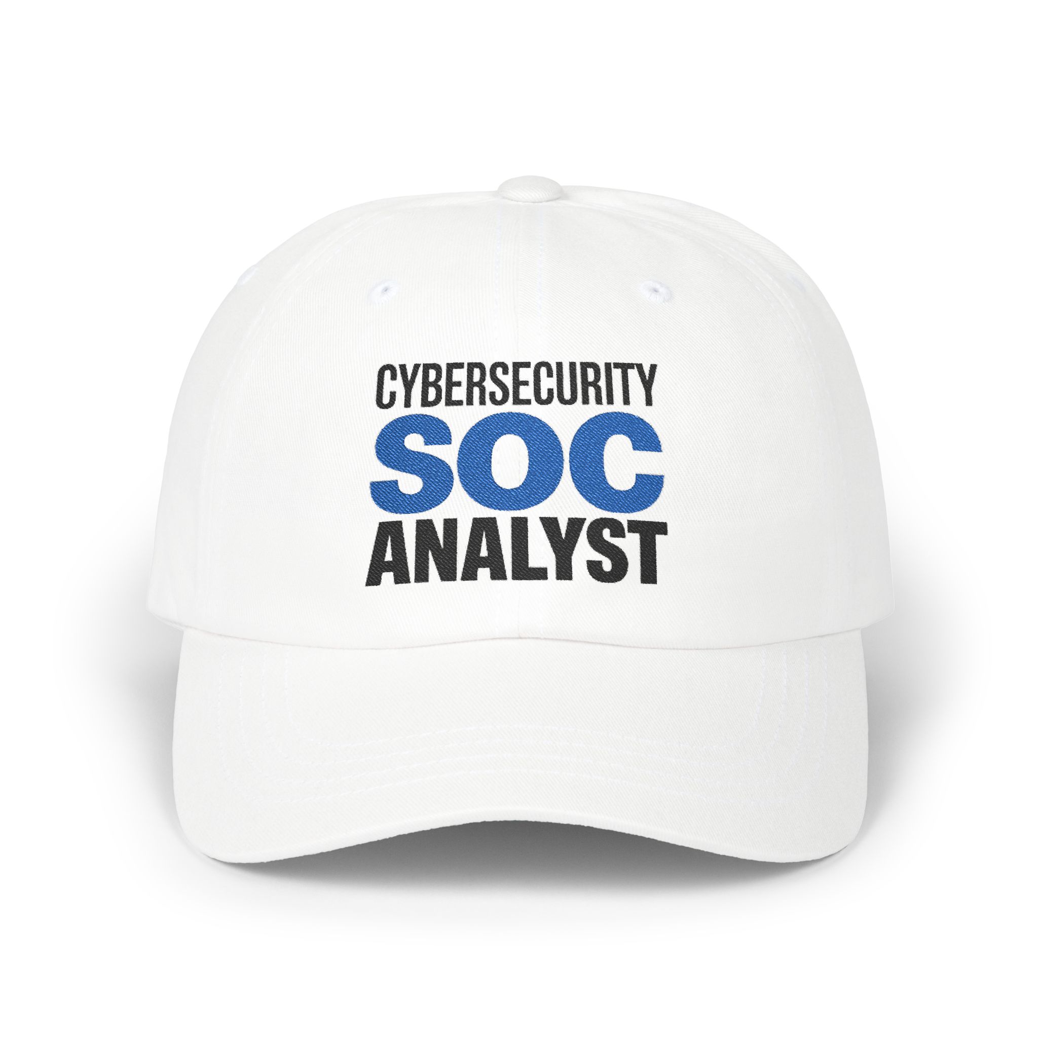 Level up your fit with a dad hat that speaks fluent infosec. Built by Choppiz for the blue team community, this classic cap blends streetwear style with cybersecurity pride. The front features CYBERSECURITY, SOC, and ANALYST embroidery in black and blue that pops on white. It is soft, breathable, and ready for long shifts and longer debriefs. The unstructured, low-profile crown gives a relaxed look while the antique brass buckle dials in your fit. Six-panel construction, a Permacurv® visor, four-row stitching, and a matching under-visor deliver everyday durability.