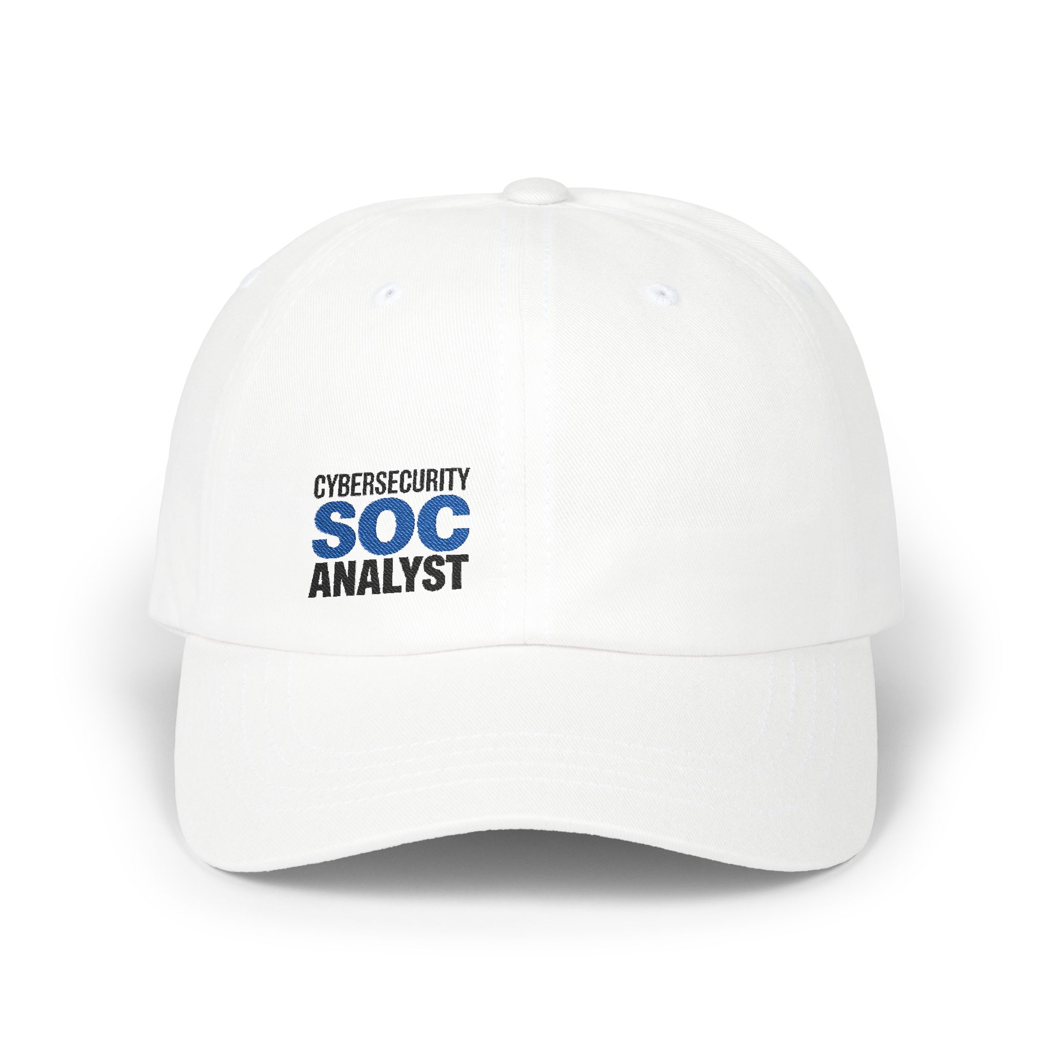 Upgrade your everyday uniform with a clean, white cap that speaks fluent blue team. This classic dad hat is soft, breathable, and ready for long shifts and short sprints. The unstructured, low-profile fit delivers that relaxed streetwear look, while the antique brass buckle closure dials in a secure fit. Built for durability with six-panel construction, a Permacurv® visor, and four-row stitching on the visor. The matching under-visor keeps the silhouette sharp. CYBERSECURITY SOC ANALYST is embroidered on the front panel in black and bold blue, a smart nod to Security Operations Center pros and the wider infosec community.