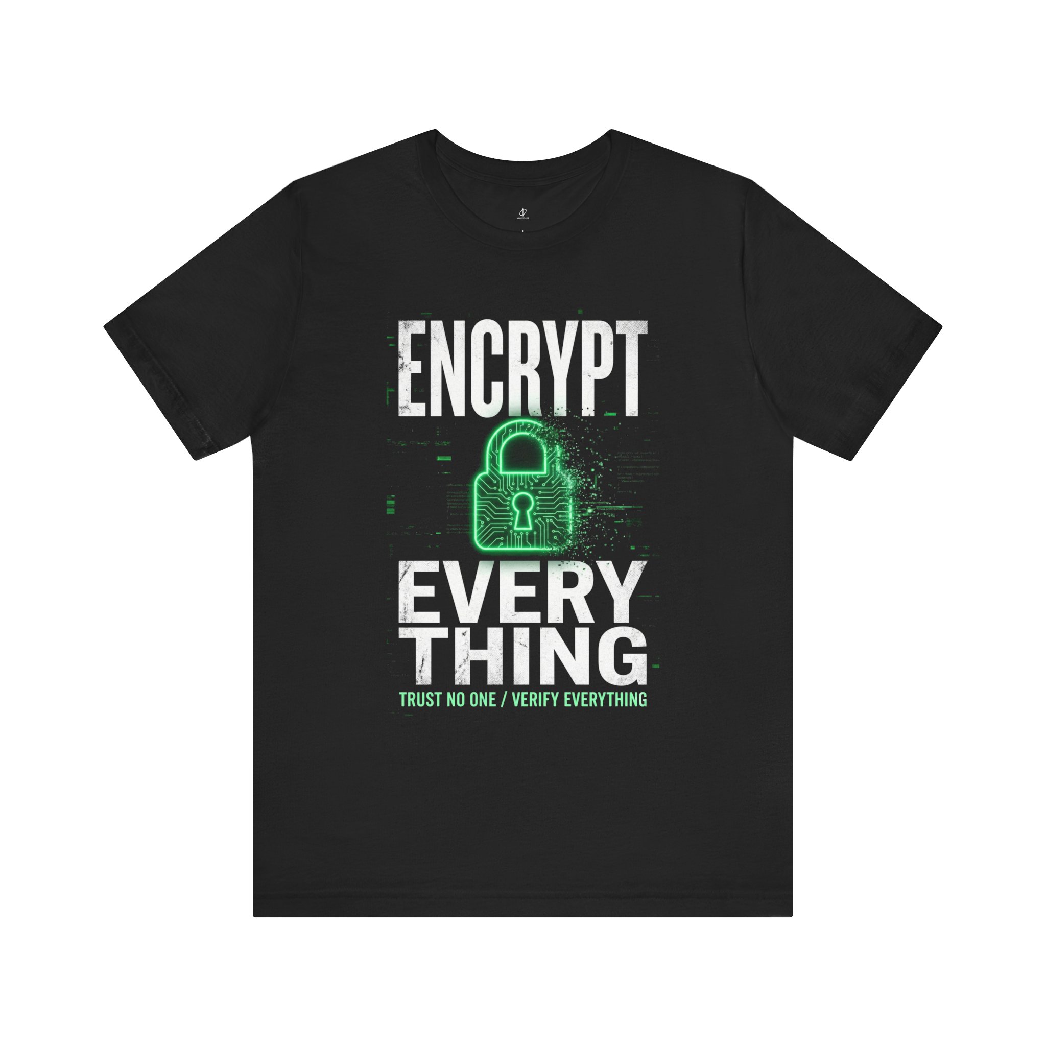 For the folks who live by least privilege and side-eye every request, this tee says it out loud: ENCRYPT EVERY THING. The chest graphic stacks bold glitch-style lettering over a padlock icon packed with circuit-board detail, then finishes with the line that sums up modern security culture: TRUST NO ONE / VERIFY EVERYTHING.