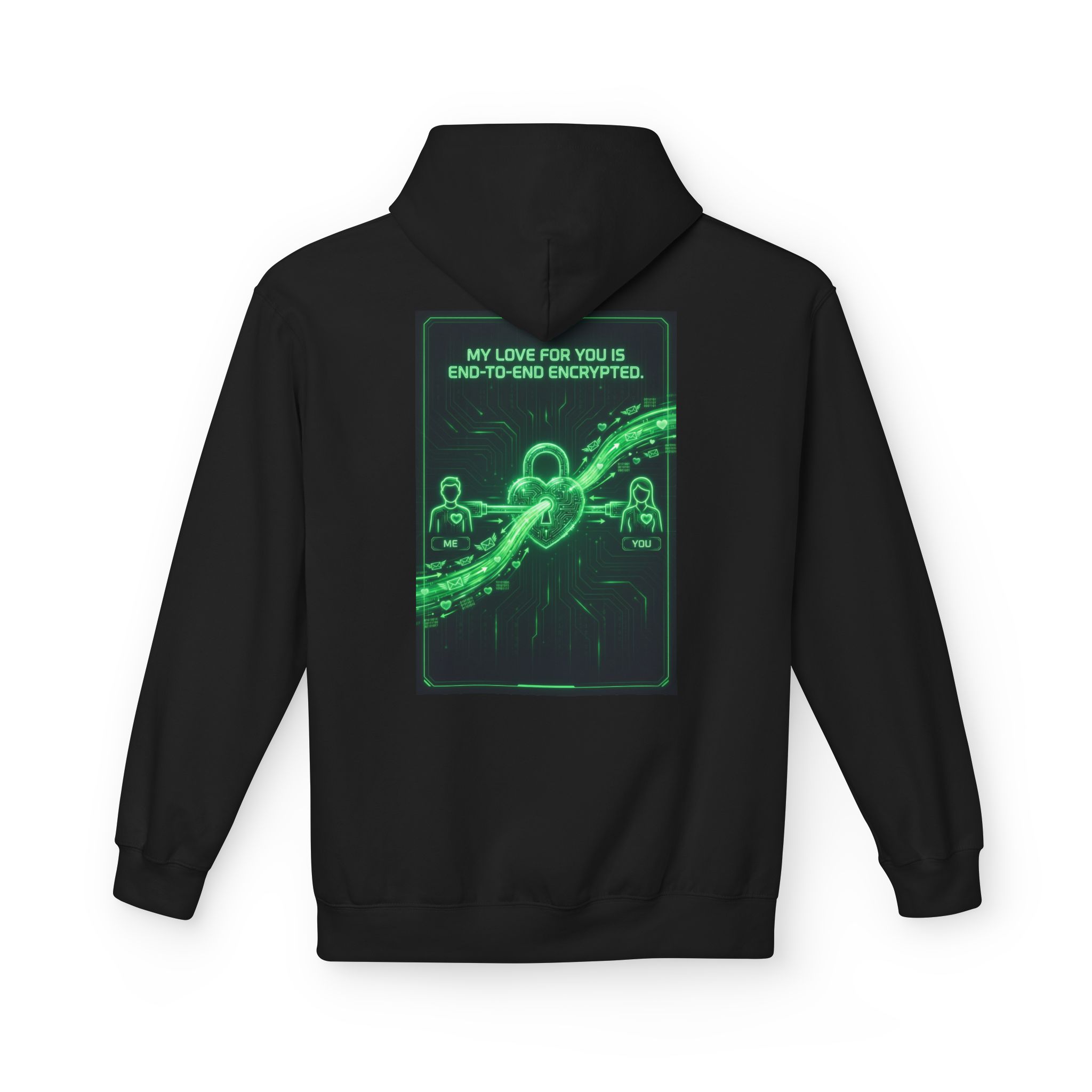 Some people write love letters. We ship secure packets. This hoodie is for couples who treat privacy like a love language and know the real romance is a connection that stays between ME and YOU. The back graphic reads “MY LOVE FOR YOU IS END-TO-END ENCRYPTED.” in a clean, neon-style layout, framed like a digital interface with subtle circuit patterns that scream InfoSec without trying too hard.
