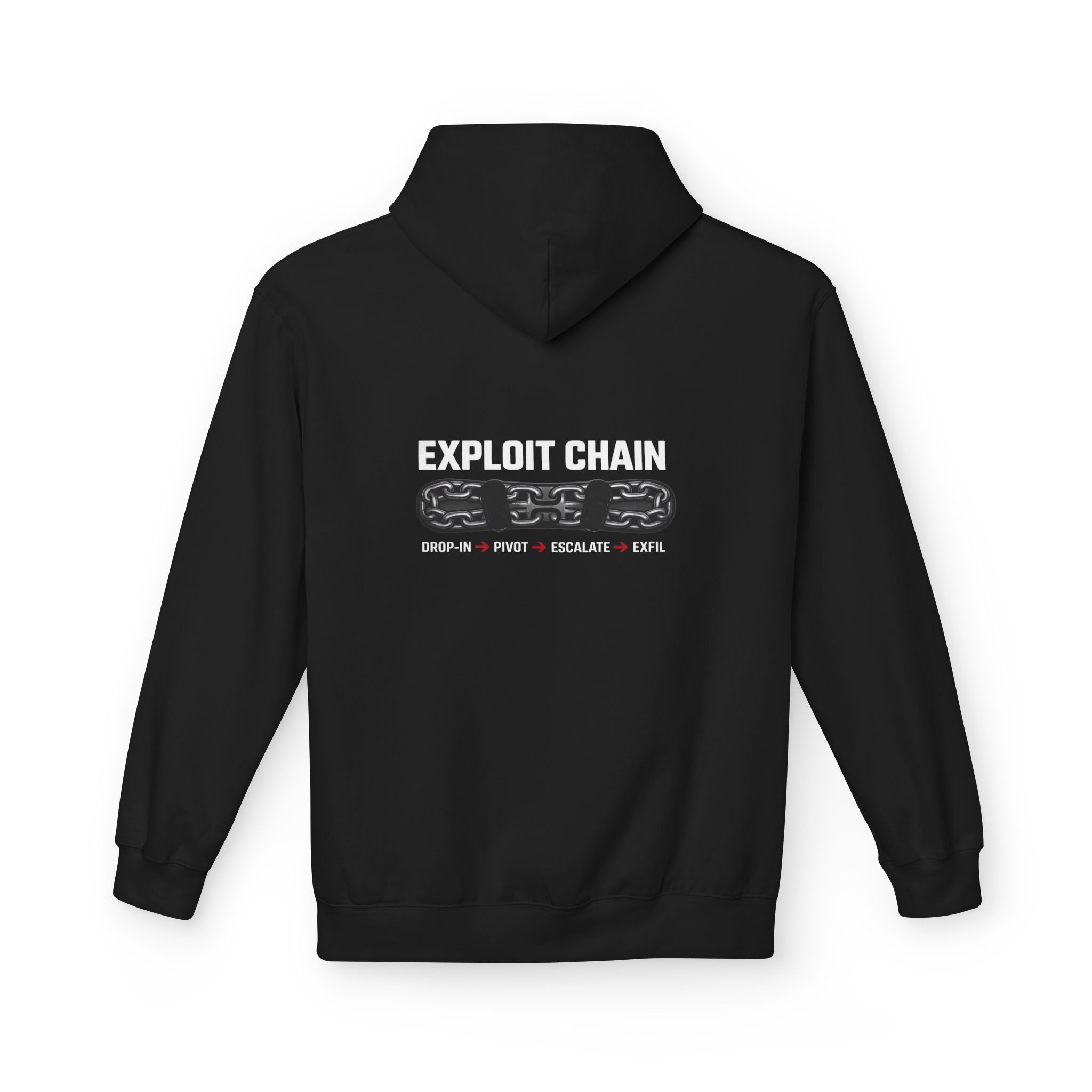 This hoodie is for the people who read breach reports like bedtime stories and treat “initial access” as a personality trait. The back print lays out the full operator mindset: bold EXPLOIT CHAIN text up top, a metallic three-link chain graphic, then the clean progression every pentester recognizes: DROP-IN → PIVOT → ESCALATE → EXFIL. It’s subtle enough for everyday wear, loud enough for the infosec crowd to clock it instantly.
