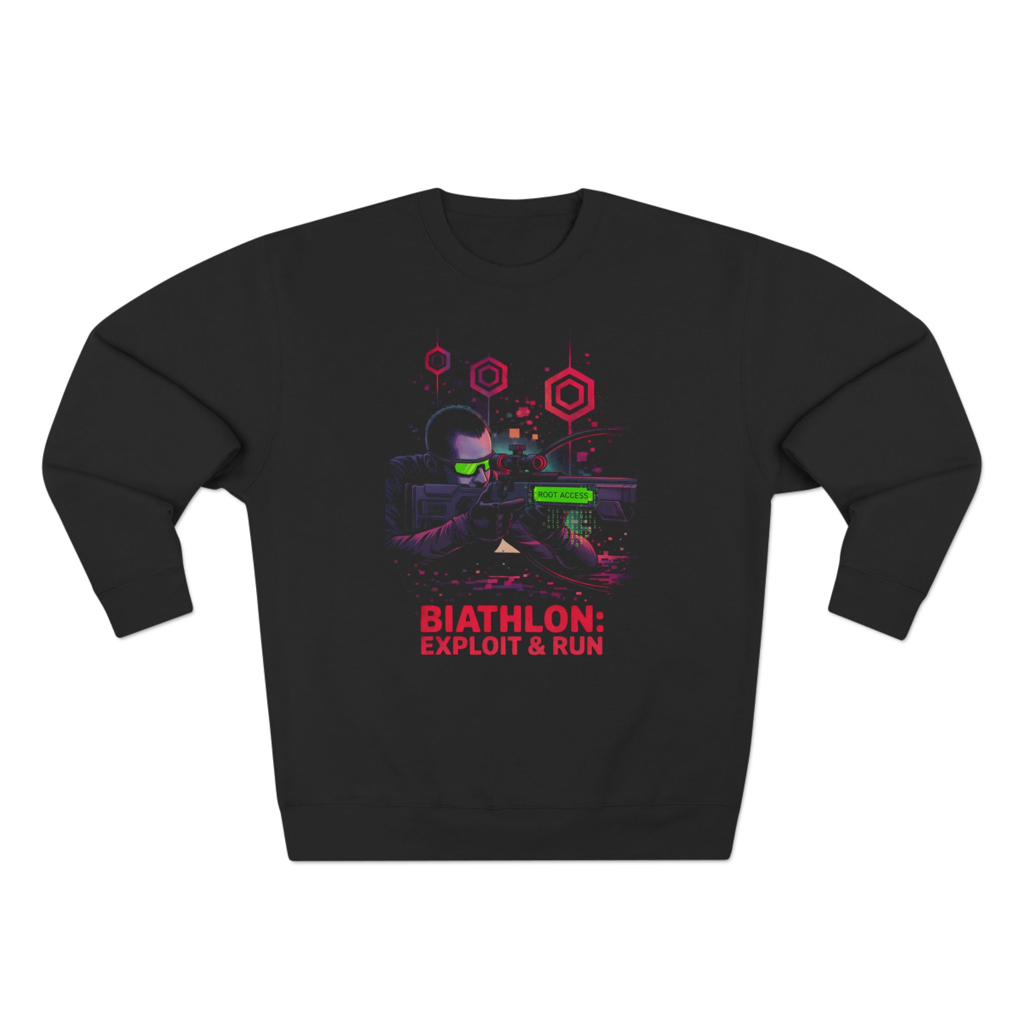 The Biathlon: Exploit & Run Premium Sweatshirt isn’t just a sweatshirt; it’s a tribute to the ultimate high-stakes puzzle of the Winter Games. We’ve taken the raw intensity of the biathlon, the heart-pounding transition from a 5km sprint to a dead-silent trigger pull, and re-coded it with a gritty, cyberpunk edge.