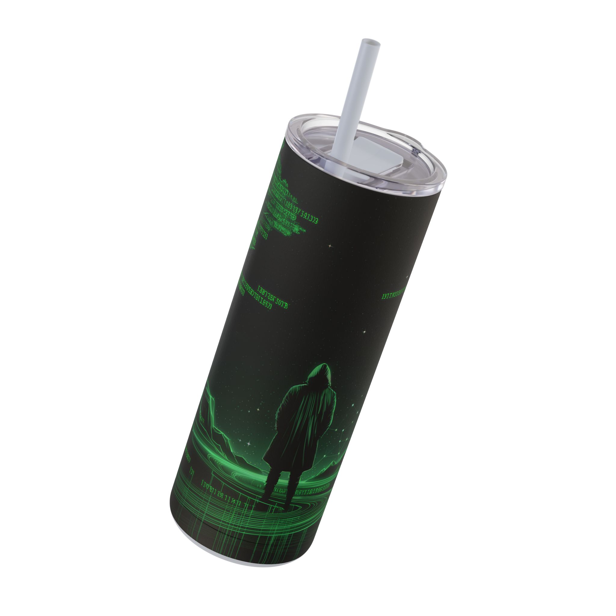 Featuring a design that captures a silhouette cloaked figure staring into a digital grid of data streams and code fragments, this tumbler blends hacker subculture and cyberpunk vibes into your practical gear. It’s not just a tumbler; it’s an identity statement for tech warriors, cybersecurity enthusiasts, and anyone who runs on caffeine and code.