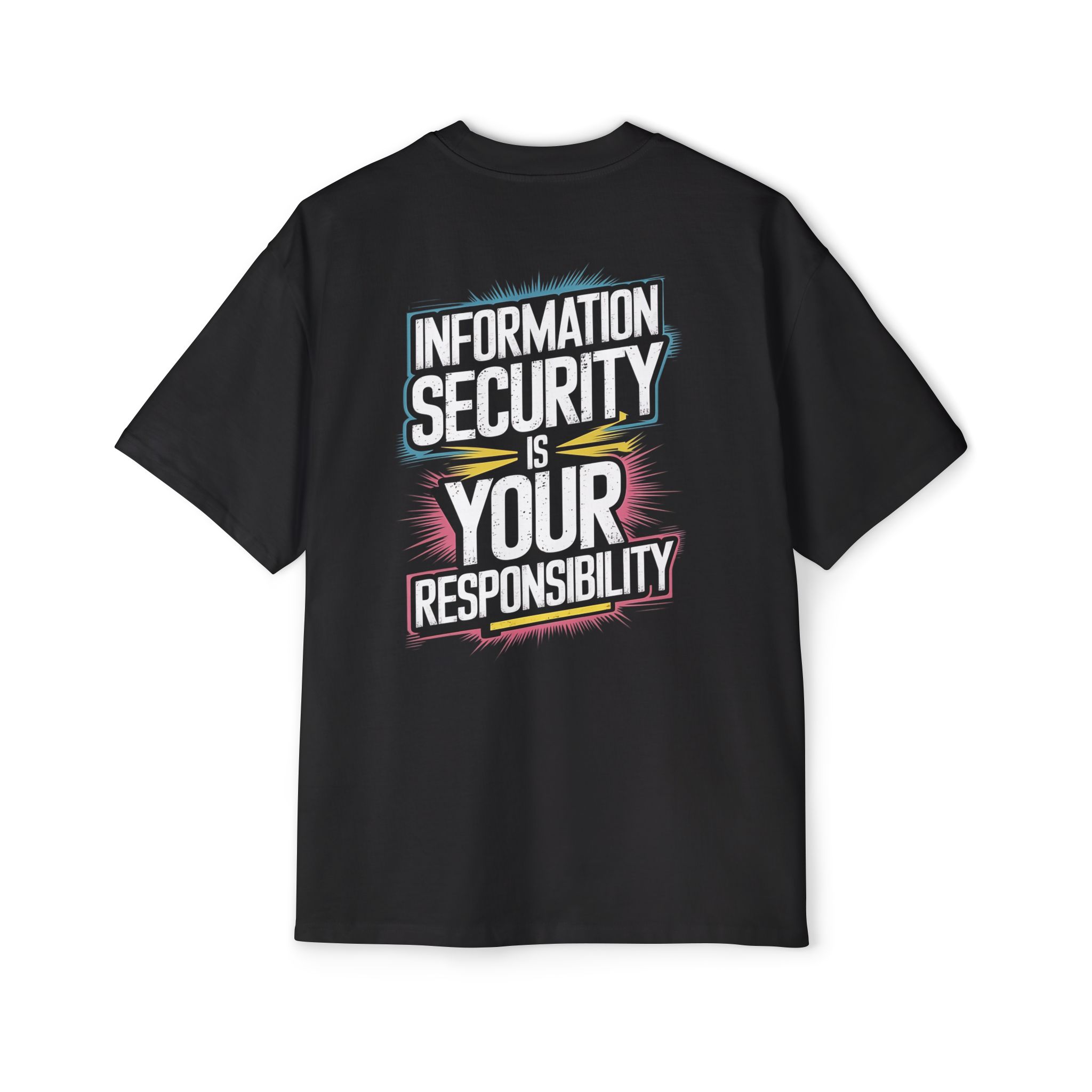 The back graphic boldly proclaims “INFORMATION SECURITY IS YOUR RESPONSIBILITY” in a striking retro-inspired font style reminiscent of classic arcade games. Each word is uniquely styled with textured fills, subtle 3D shadows, and dynamic burst patterns delivering a vibrant, engaging message about personal accountability in information defense. This tee is not just apparel; it is a declaration that cybersecurity isn’t just a job, it’s a responsibility.