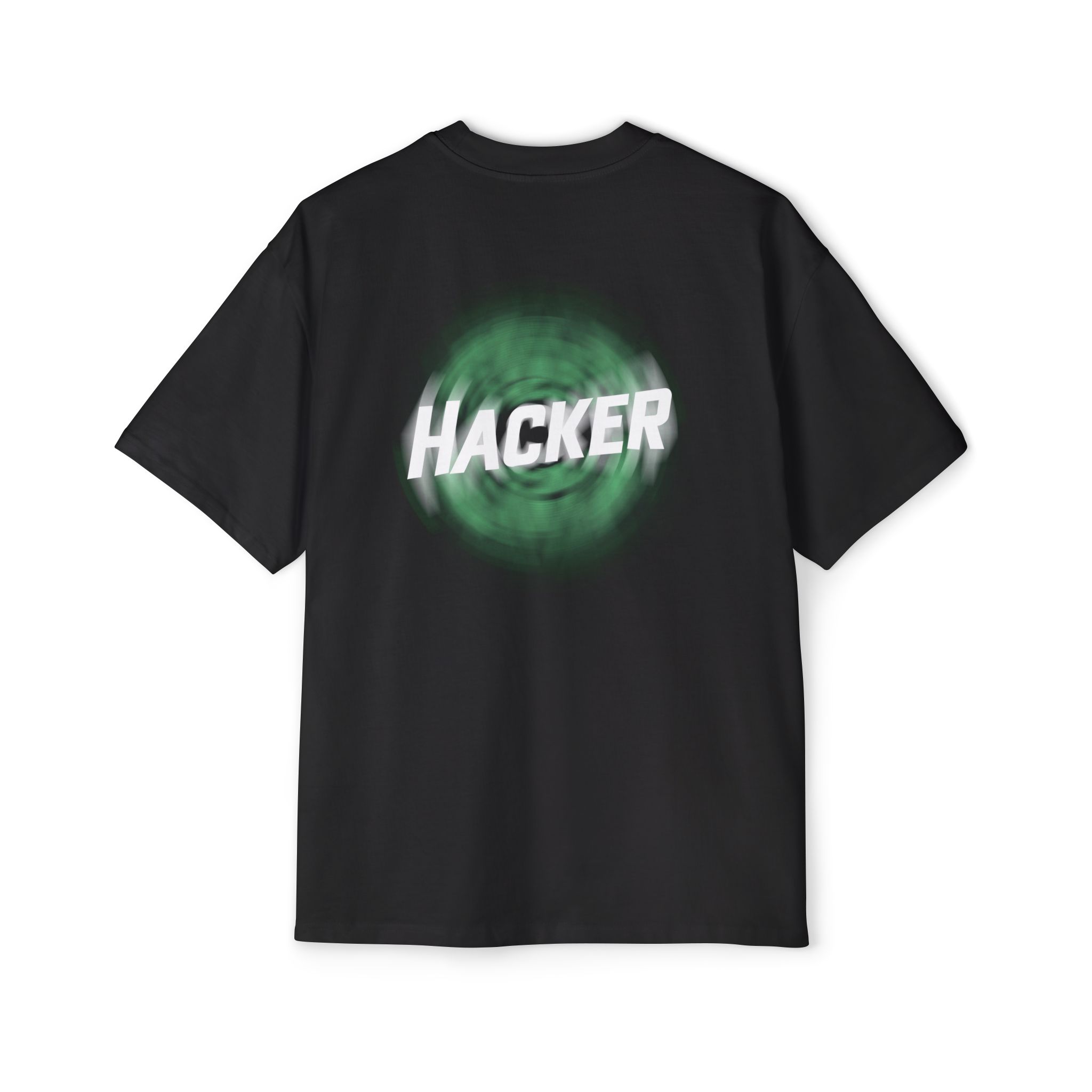 Graphic Description: Centered on the upper back is a bold “HACKER” text in all caps rendered in a striking sans-serif font. The horizontally motion-blurred letters give a vibe of high-speed digital movement. Behind it, a swirling vortex graphic spins in vivid shades of green, creating a glowing, almost otherworldly effect that merges seamlessly with the fabric. It’s a visual statement for the tech-savvy crowd embracing cyberpunk and hacker culture.