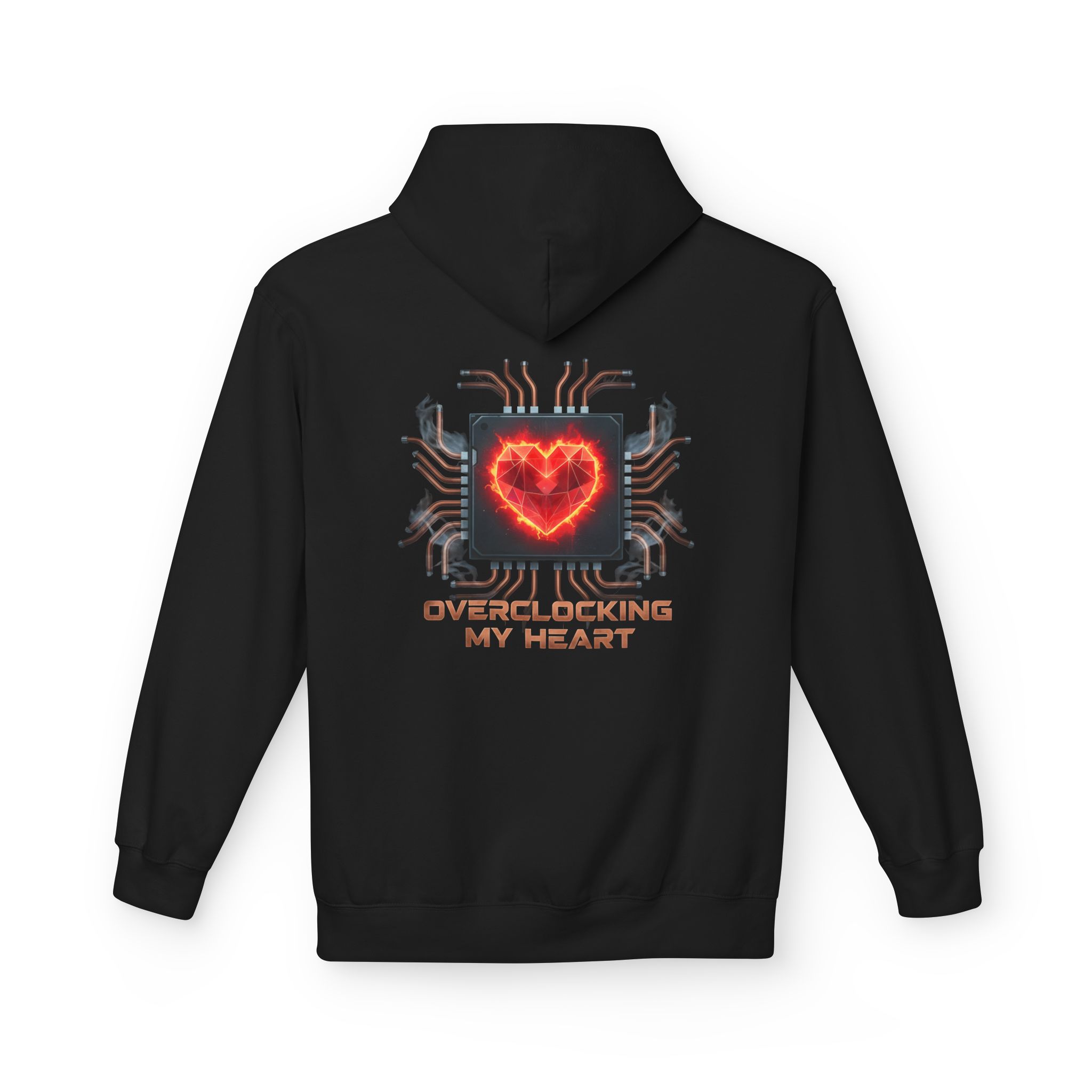 This hoodie brings the best kind of dual-use energy: a faceted, glowing heart rendered like a crystal core, locked inside a CPU-style frame with pins, traces, and heat-haze vibes. The circuit lines radiate outward like your pulse just hit turbo, while the back print seals the deal with the phrase “OVERCLOCKING MY HEART” in bold, blocky type that looks straight out of a hardware lab.