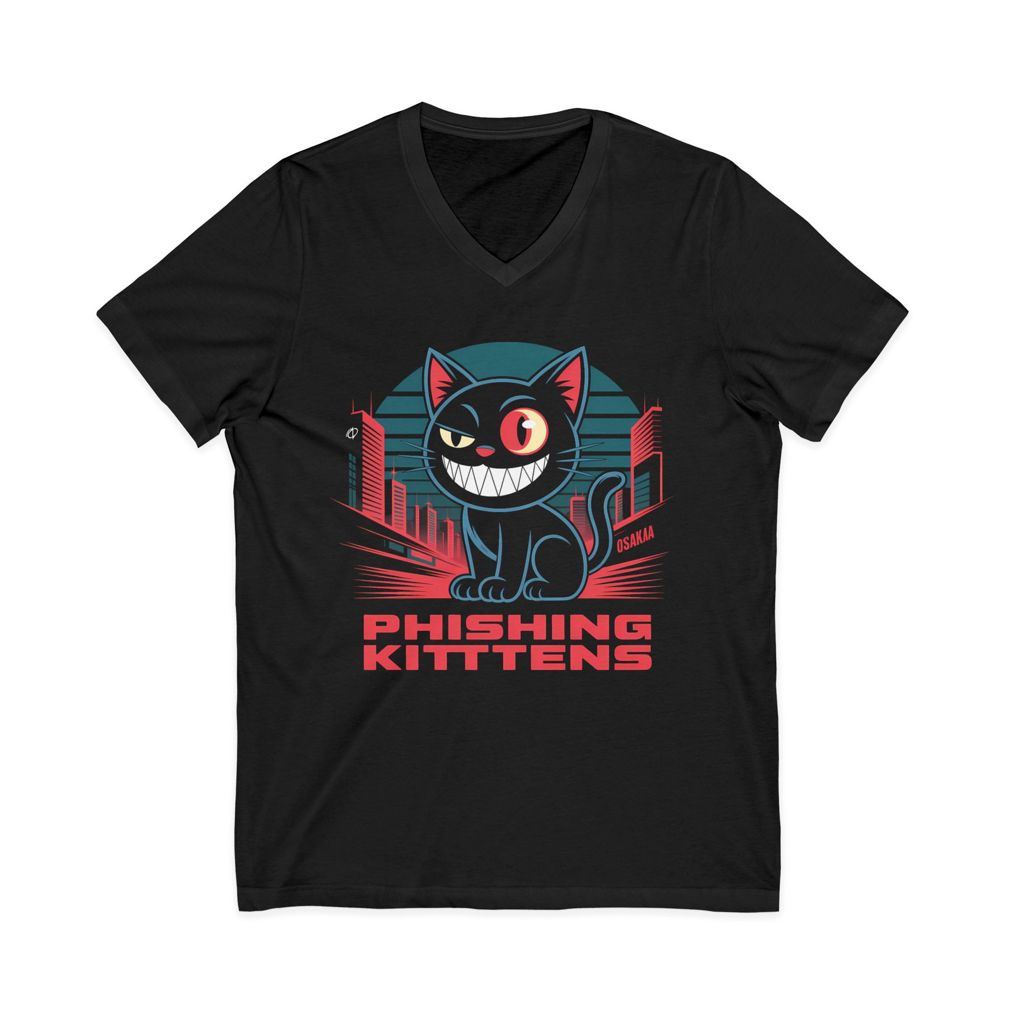 This V-neck tee merges street-ready style with cyberpunk attitude. Featuring a sharp, stylized black cat with a mischievous grin and a cybernetic eye, the design channels retro-futurism and synthwave energy. The cat sits amidst a neon cityscape grid and digital horizon, invoking the subtle menace of phishing scams but with a playful edge. Perfect for anyone in tech, cybersecurity enthusiasts, or those who appreciate clever, bold graphic tees with a tech twist.