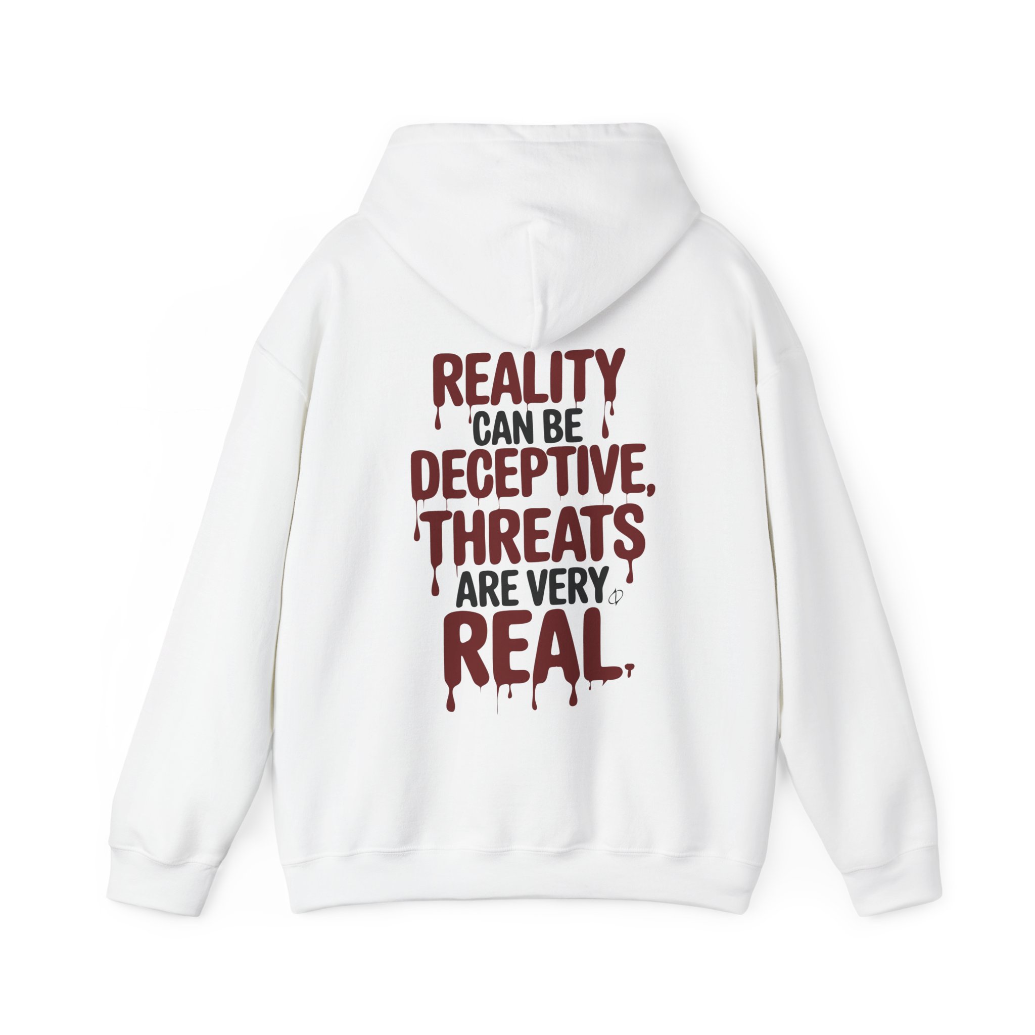 Unveiling the ultimate statement piece: the “Reality Can Be Deceptive. Threats Are Very Real” hoodie!