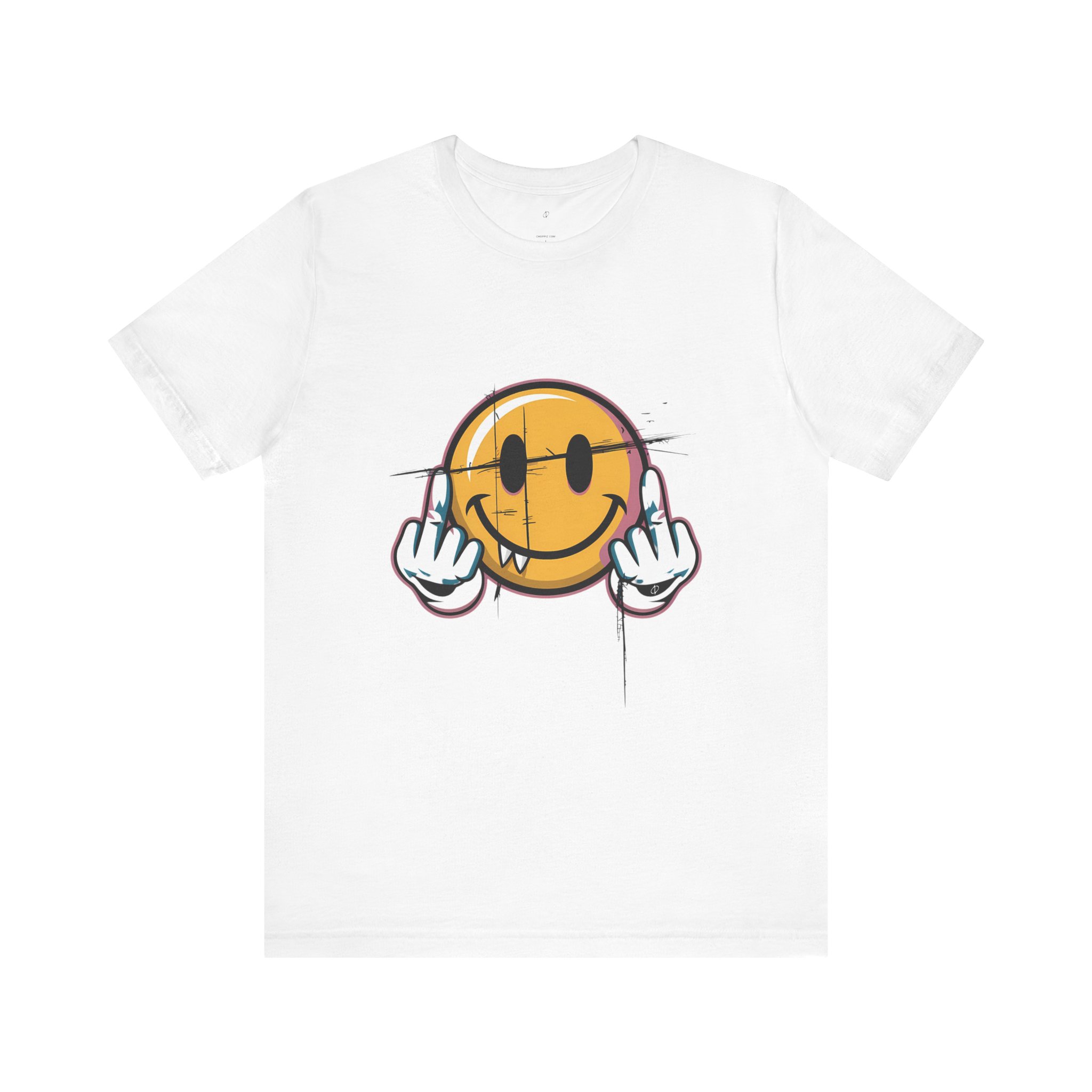 This unisex v-neck tee makes a bold statement at the intersection of cybersecurity edge and street style attitude. Featuring a distressed, stylized smiley face with vampiric fangs and crossed out ‘X’ eyes, this graphic flips the script on classic iconography with a sarcastic, rebellious twist. Cartoonish hands boldly extend the middle finger on both sides of the design, reinforcing a sense of defiant mischief perfect for modern punk and grunge enthusiasts alike.