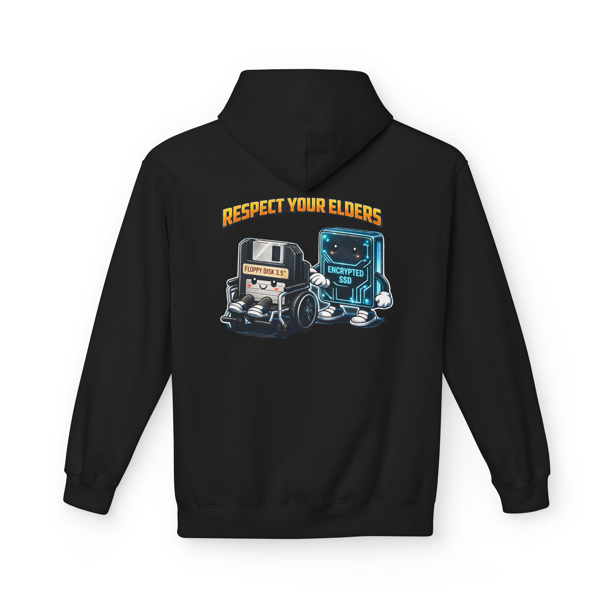Across the back, “RESPECT YOUR ELDERS” sits above an adorable scene: a classic 3.5” floppy disk rolling in a wheelchair while a cheerful ENCRYPTED SSD stands by like a proud (and very secure) next generation. It’s a playful nod to the days when saving actually meant something, and a wink to modern life where encryption is just common sense.