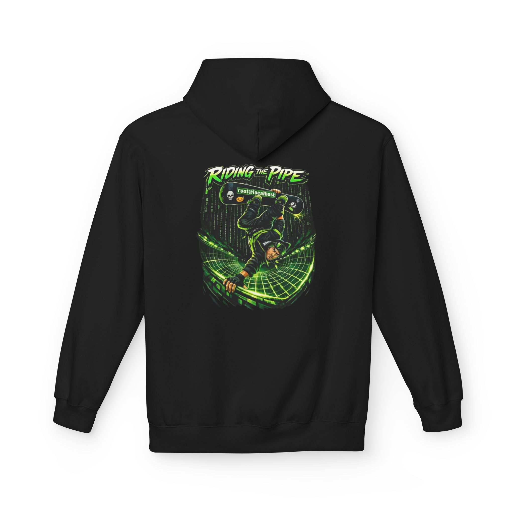 Some people ride the half-pipe. Some people ride the pipeline. This Riding the Pipe root@localhost Hacker Hoodie is built for the crew that can talk tricks and terminal in the same sentence. The back graphic throws an inverted skateboard move over a glowing wireframe half-pipe, with code rain falling like a system log you actually want to read. It lands with the bold “RIDING THE PIPE” headline and the classic root@localhost signature, a clean nod to Linux culture, pentesters, and anyone who has ever lived in a shell.