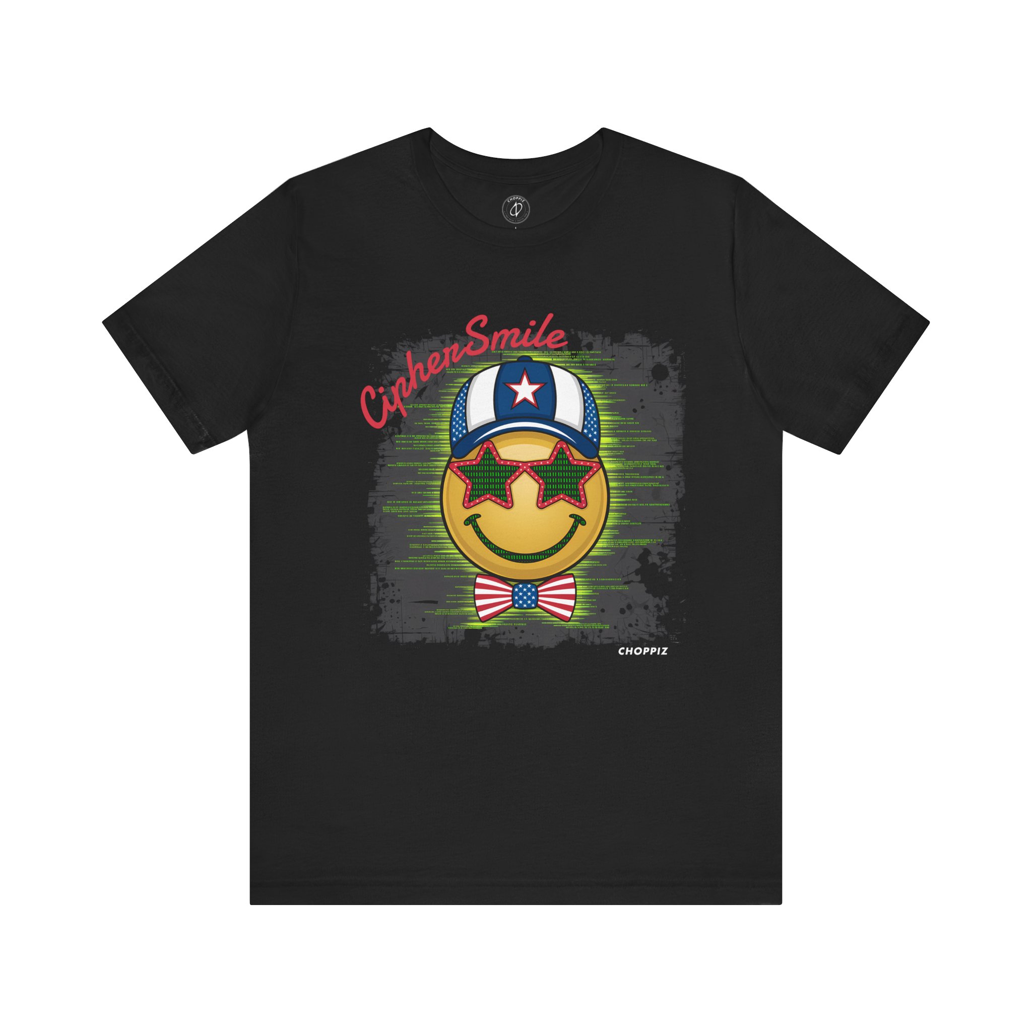 This iconic tee merges the coding culture with a nod to classic Americana. It’s not just a shirt; it’s a statement piece for anyone fluent in binary or street style. The front features a cheerful smiley face wearing a star-spangled baseball cap, oversized star-shaped sunglasses filled with green binary code, and a patriotic bow tie inspired by the American flag. Set against a textured, grunge background interwoven with vertical lines of neon-green binary, this design captures the core of tech-savvy patriotism.