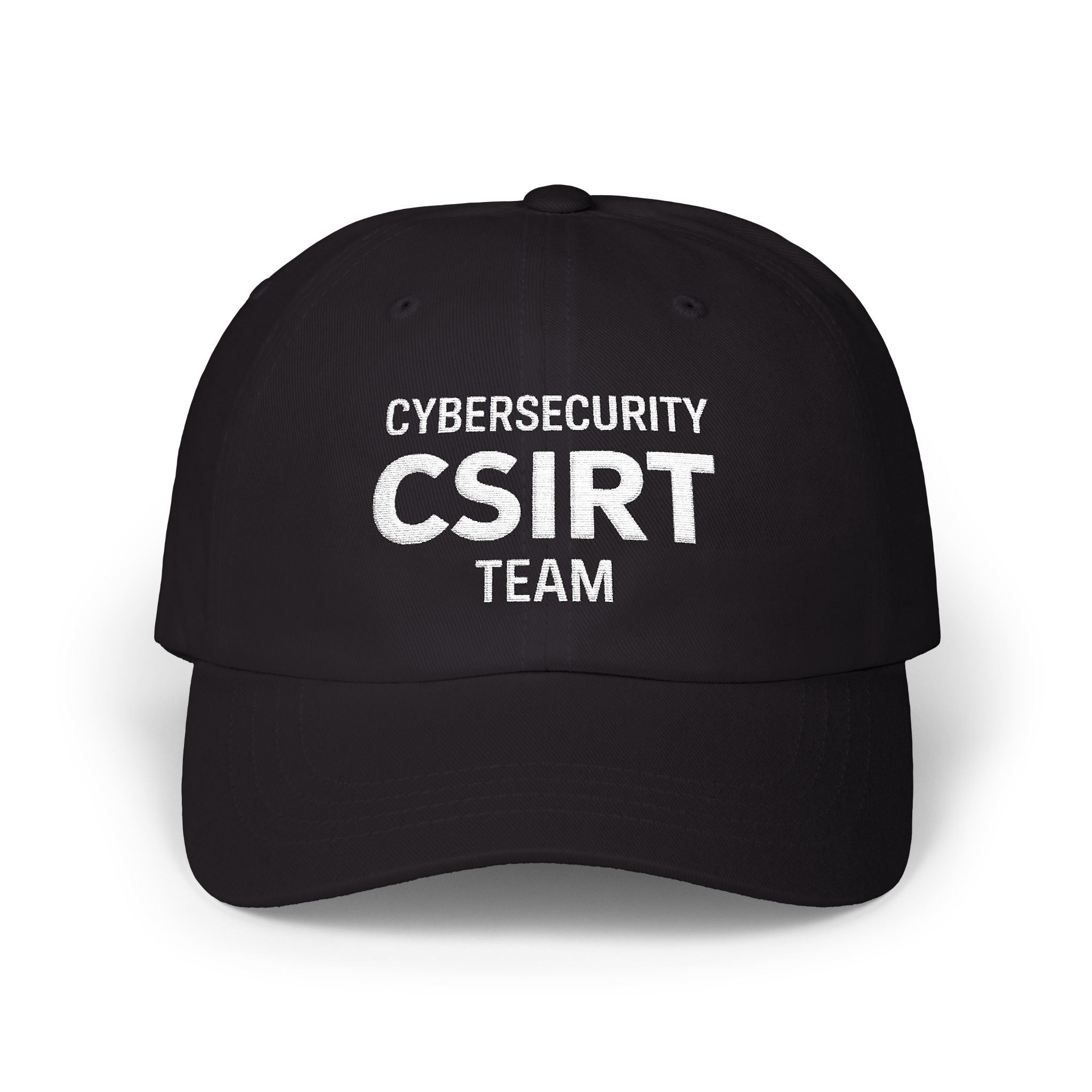 Rep your cyber crew with this sharp, unstructured dad hat that balances streetwear vibe and professional edge. Crafted from a softly textured fabric with a classic six-panel design, this cap features sturdy, multi-stitched curved brim for that perfect fit and form. The fabric-covered button atop adds a vintage touch that veterans appreciate. Boldly embroidered on the front are the words CYBERSECURITY, CSIRT, and TEAM, with ‘CSIRT’ standing out in a large block font that commands respect. This cap is as comfortable as it is iconic, designed for everyday wear whether you are on the front lines of digital defense or headed to a casual meet-up.