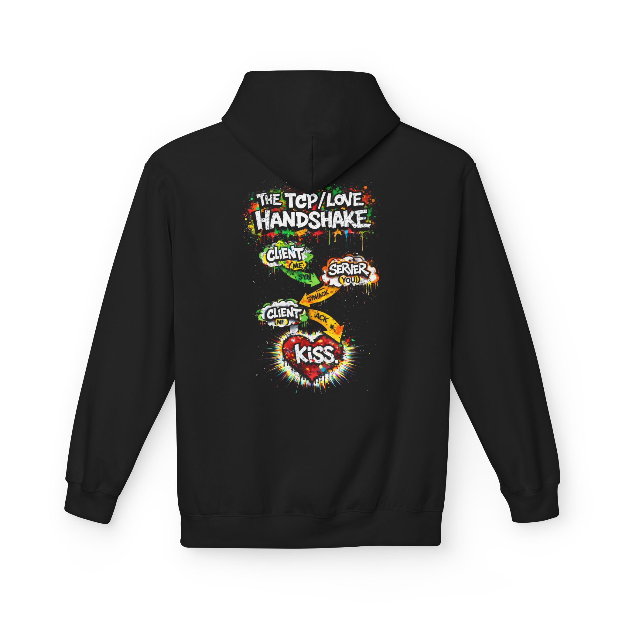 This hoodie turns the classic client and server connection into a funny love story. The back print walks through the steps with CLIENT (ME) and SERVER (YOU): SYN, SYN/ACK, ACK, and then it seals the deal with a big heart that says “KISS”. Up top, “THE TCP/LOVE HANDSHAKE” headline brings it all together in a bold graffiti splash style that pops without feeling too serious.