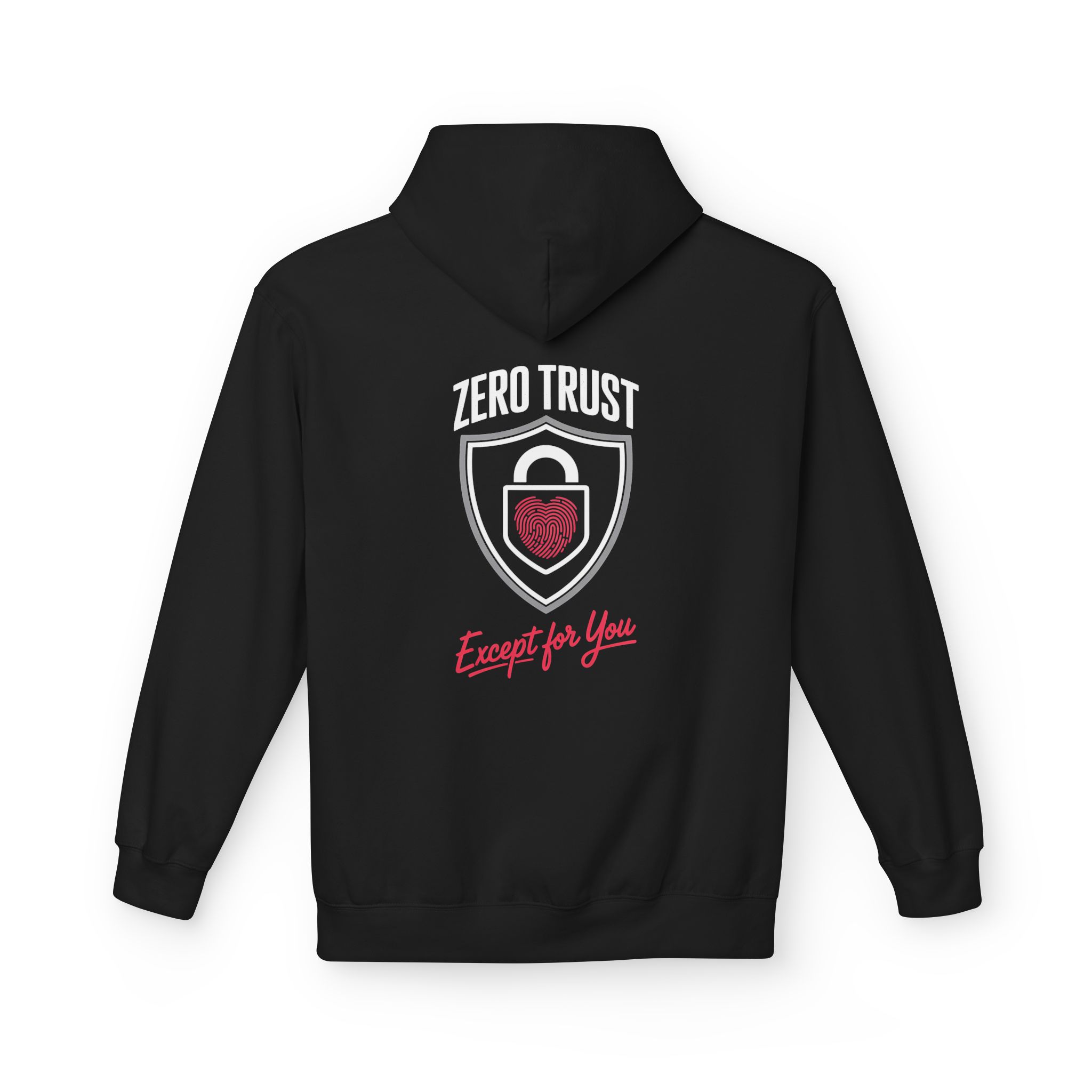 Some people give flowers. We ship a policy exception. This hoodie is built for the couples who speak fluent MFA, roast weak passwords for fun, and still make time for a little romance between incident tickets. The back graphic reads ZERO TRUST above a shield and padlock emblem, complete with a heart-shaped fingerprint, then hits with the line that says it all: Except for You. It is the perfect inside joke for your favorite SOC analyst, security engineer, pentester, or DevSecOps partner.